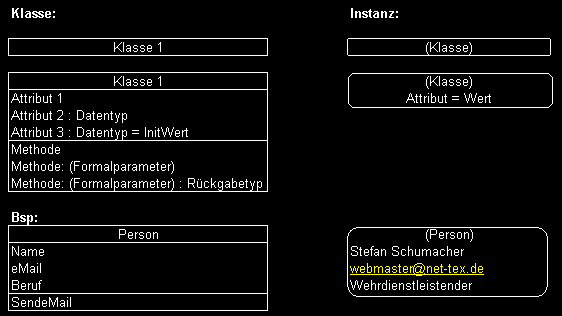 | Methoden | - Funktionen bzw. Prozeduren - legen Reaktion der Objekte auf Nachrichten fest |